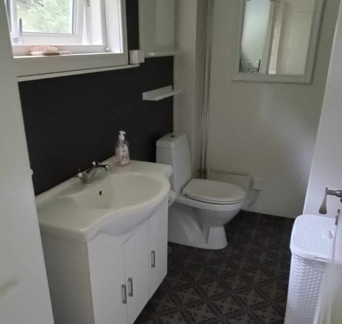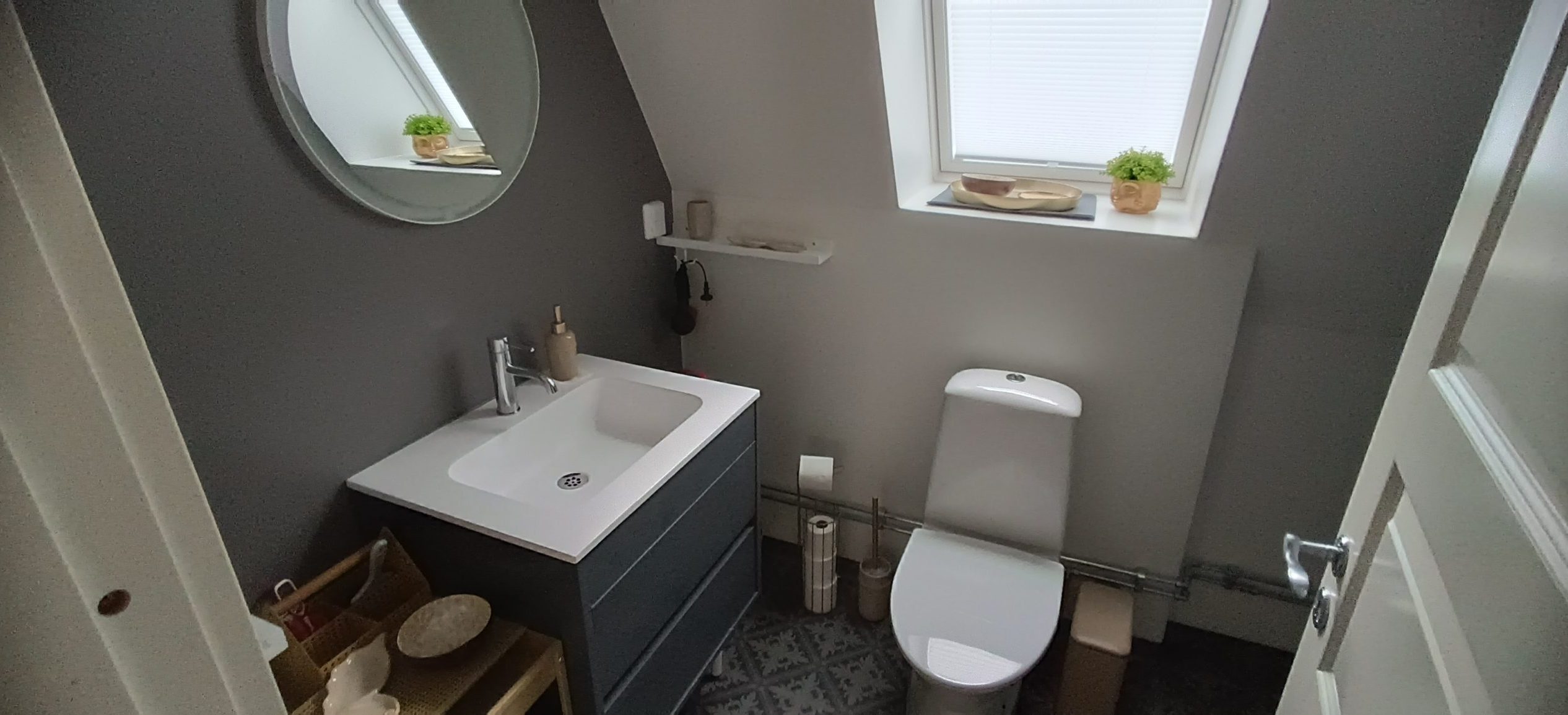 In der ersten Etage befindet sich ein Badezimmer mit Toilette und Badewanne. Das zweite Bad liegt im Erdgeschoss und verfügt über eine Dusche, Toilette, sowie eine Waschmaschine und einen Trockner.